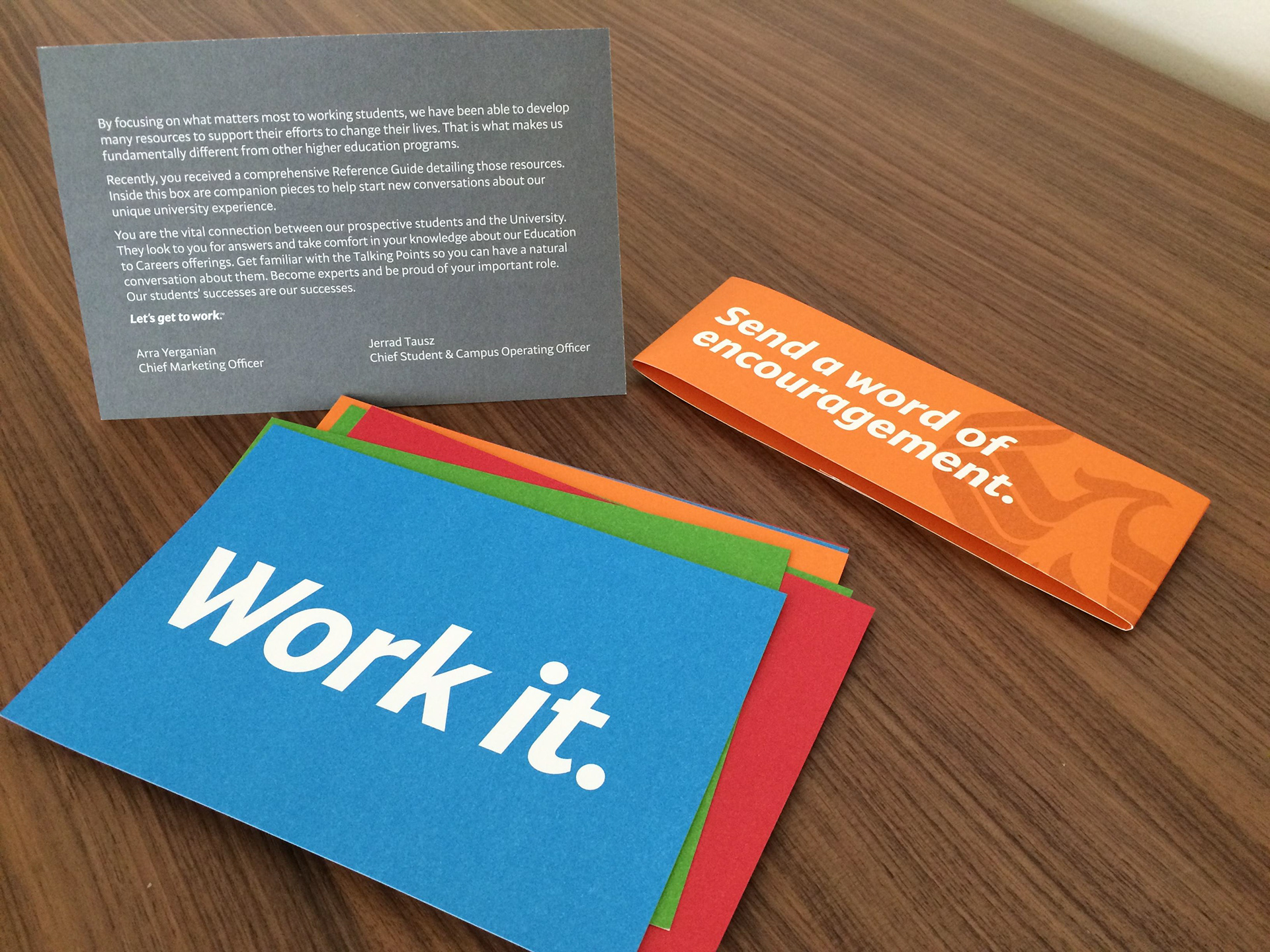 We created a toolkit of sorts to announce and promote the current National Campaign called “Let’s get to work” for employees on campuses. It contained a mix of educational items about the National Campaign and postcards that could be used by call center advisors to send students after having talked. There were over 200 campuses and we shipped these kits to create an inclusive culture and unify teams across the country.